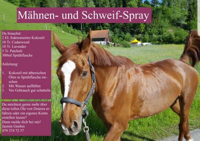 Interesseiern Dich natürliche Lösungen für Dich und Deine Liebsten (inklusive Pferd) und du möchtest Deinem Pferd gerne Entspannung und gemeinsame Zeit mit wohltuenden ätherischen Ölen bieten? Das bietet der Aroma - Anwendung -Kurs am Pferd: · Du erlernst alle Grundlagen Schritt für Schritt, um eine sichere und sinnvolle Anwendung mit ätherischen Ölen am Pferd durchführen zu können. · Du erlernst den praktischen Einsatz am Pferd, um eine Aromamassage sinnvoll und selbständig durchführen zu können. · Nach dem Kurs kannst Du neben der sicheren Anwendung der Öle auch Handgriffe der Massagetechnik eigenverantwortlich durchführen und dadurch das tägliche Wohlbefinden deines Pferdes positiv unterstützen. · Du erhälst für die ersten Anwendungen ein kleines Basis-Set ätherischer Öle und Trägersubstanz zur sofortigen Nutzung. · Du erhälst umfassende Unterlagen über die Schulung &Aroma- Massage. Kosten: (mind. 4 Teilnehmer) 90.- pro Teilnehmer (inkl. Unterlagen, ätherischen Ölen, Trägersubstanz) Anfahrtsentschädigung nach absprache. Jeder kann an seinem Pferd selbst arbeiten oder zu zweit.